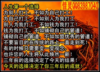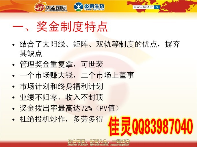 佳靈老師簡(jiǎn)介:華盛國(guó)際團(tuán)隊(duì)核心領(lǐng)導(dǎo)人之一,區(qū)域總監(jiān),團(tuán)隊(duì)金牌講師,白手起家,運(yùn)作湖南炎帝期間親自考察總公司和多個(gè)公司美好生活體驗(yàn)館。炎帝生物第一品牌華盛國(guó)際團(tuán)隊(duì)超級(jí)領(lǐng)導(dǎo)人佳靈老師QQ83987040團(tuán)隊(duì)提供全國(guó)各市場(chǎng)資源共享,講師團(tuán)全國(guó)各地支持。直銷E化,電子商務(wù),您的最佳創(chuàng)業(yè)平臺(tái)!解決了傳統(tǒng)行業(yè)的許多弊端,您我的最佳選擇!(1)保險(xiǎn)賣的是一個(gè)承諾,一個(gè)無(wú)形的產(chǎn)品,而直銷賣的是真真實(shí)實(shí),實(shí)實(shí)在在的
