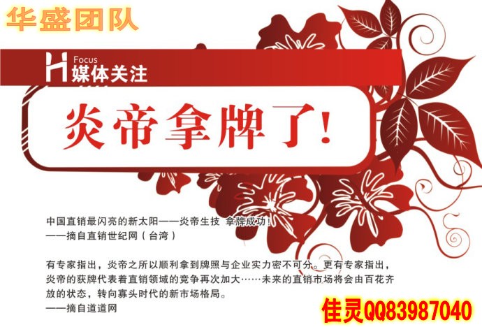 炎帝生物華盛國(guó)際集團(tuán),大夢(mèng)想大格局大啟動(dòng)??!華盛國(guó)際領(lǐng)航人,擁有數(shù)十年直銷經(jīng)驗(yàn)和網(wǎng)絡(luò)營(yíng)銷經(jīng)驗(yàn),曾經(jīng)帶領(lǐng)團(tuán)隊(duì)在2個(gè)直銷公司做到中國(guó)區(qū)前三名,團(tuán)隊(duì)3年銷售額超過(guò)10億,是中國(guó)唯一個(gè)充分結(jié)合傳統(tǒng)直銷和網(wǎng)絡(luò)營(yíng)銷的頂級(jí)品牌團(tuán)隊(duì)!經(jīng)過(guò)全面對(duì)比中國(guó)拿牌31家公司,最終和炎帝強(qiáng)強(qiáng)聯(lián)盟,實(shí)現(xiàn)大夢(mèng)想而大啟動(dòng),誠(chéng)邀各路精英加盟合作!佳靈老師簡(jiǎn)介:華盛國(guó)際團(tuán)隊(duì)核心領(lǐng)導(dǎo)人之一,區(qū)域總監(jiān),團(tuán)隊(duì)金牌講師,白手起家,運(yùn)作湖南炎帝