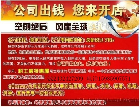 一個(gè)轟動(dòng)全球的商業(yè)模式,在家創(chuàng)業(yè),零投資無風(fēng)險(xiǎn)、換一個(gè)品牌消費(fèi)就能換一個(gè)人生!花您本來就該花的錢,賺您本來賺不到的錢!低門檻、零投入!兼職、創(chuàng)業(yè)均可!一臺(tái)電腦就可以做全球市場!無需推銷,無需囤貨,無需好口才!一個(gè)人人可為的事業(yè)機(jī)會(huì)。我們會(huì)告訴您如何足不出戶,打造您的網(wǎng)上“沃爾瑪”,網(wǎng)絡(luò)地面同時(shí)經(jīng)營,擁有一家經(jīng)營幾千款世界知名品牌的網(wǎng)上超市嗎?類別包括家居日用、美容護(hù)膚、營養(yǎng)保健、香水彩妝、汽車保養(yǎng)