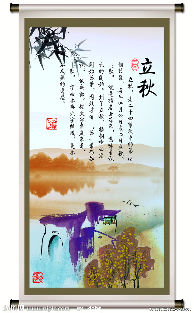 明天便是立秋,也是我的生日,順道祝福一下,哈哈!大暑之后,時序到了立秋。秋是肅殺的季節(jié),預(yù)示著秋天的到來。歷書曰:“斗指西南維為立秋,陰意出地始?xì)⑷f物,按秋訓(xùn)示,谷熟也?!边@時太陽黃經(jīng)為135度。從這一天開始,天高氣爽,月明風(fēng)清,氣溫由熱逐漸下降。有諺語說:“立秋之日涼風(fēng)至”,即立秋是涼爽季節(jié)的開始。但由于我國地域遼闊幅員廣大,緯度、海拔高度不同,實(shí)際上是不可能在立秋這一天同時進(jìn)入涼爽的秋季的。從