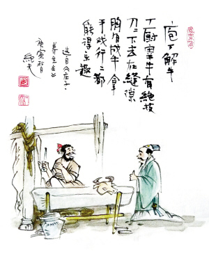 “養(yǎng)生”一詞最早出現(xiàn)在我國的兩本古籍上,一處見于《莊子·養(yǎng)生主》中的“庖丁解?!币晃模硪惶幰娪凇饵S帝內(nèi)經(jīng)·靈樞》中的“木神”。“庖丁解?!钡墓适拢覀冊谥袑W(xué)的語文課本上都學(xué)過,它出現(xiàn)在我國著名思想家莊子的《養(yǎng)生主》這篇文章中?!娥B(yǎng)生主》是一篇專門談養(yǎng)生之道的文章,“養(yǎng)生主”的意思就是養(yǎng)生的要領(lǐng)。莊子認(rèn)為:養(yǎng)生之道重在順應(yīng)自然,忘卻情感,不為外物所滯。我先給大家簡單介紹一下“庖丁”是什么意思。“庖