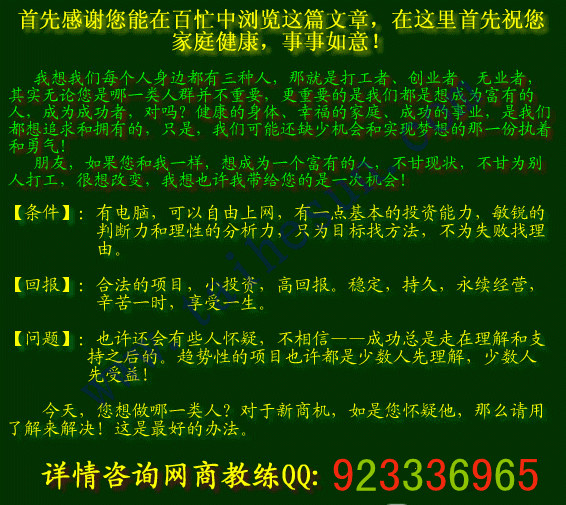 朋友:你好!如果有這樣一個(gè)穩(wěn)賺不賠的生意,無風(fēng)險(xiǎn),有人幫、有人帶,普通人打拼一年,月入過萬,努力兩年周薪過萬,你想深入了解嗎?直銷是一個(gè)不陌生的話題,而利用互聯(lián)網(wǎng)運(yùn)作直銷,將會是怎么樣的速度?加QQ:923336965交流吧真誠交友輕松創(chuàng)業(yè)模式超前——互聯(lián)網(wǎng)運(yùn)作制度優(yōu)越——拿牌公司最賺錢正規(guī)合法——保障長久運(yùn)作系統(tǒng)卓越——完善教程培訓(xùn)網(wǎng)商的必然選擇!一臺電腦、一根網(wǎng)線、少許電費(fèi),即可在家做全球市場