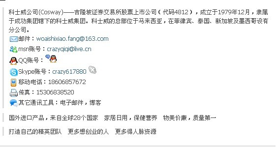 各位有志之士:你們好我處長(zhǎng)期供應(yīng)來(lái)自馬來(lái)西亞,瑞士,美國(guó),英國(guó),德國(guó)等海外各種物美價(jià)廉的商品,包括:個(gè)人纖體;廚房用品;食品與飲品;健康護(hù)理;活水機(jī);家居用品/汽車護(hù)理;香水與彩妝;個(gè)人護(hù)理;美容護(hù)膚系列產(chǎn)品,來(lái)自國(guó)外的質(zhì)量可靠,價(jià)格實(shí)惠的各款產(chǎn)品。我們將為您提供送貨上門的服務(wù)。歡迎您的加盟,有興趣合作的話,敬請(qǐng)聯(lián)系我們聯(lián)系電話:18606857672QQ:757236922郵箱:woaishix