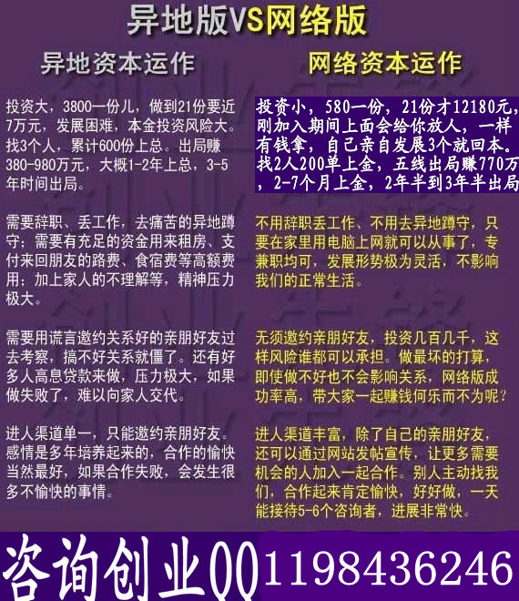 全職在線導(dǎo)師【費晴】QQ1198436246全天在線真誠交流朋友你好,看到這個貼說明你是接觸過異地的。首先我們從事異地都是對那種掙錢的模式很認可的,模式是個好模式,可為什么這么難做呢?網(wǎng)資是異地的網(wǎng)絡(luò)版本,解決了異地的弊端,發(fā)展困難的缺點所產(chǎn)生的,同樣的模式,不同的方法,不需要你去用謊言邀約自己親人朋友,不用承受感情的壓力,生活的壓力。網(wǎng)資產(chǎn)生于異地更勝于異地,朋友可以加我QQ1198436246