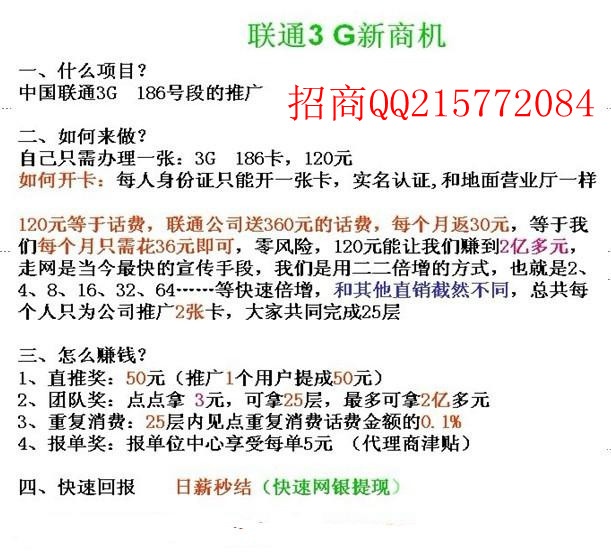 中國聯(lián)通3G項目介紹我們是以倍增的模式推廣聯(lián)通3G業(yè)務(wù)。主要產(chǎn)品:3G手機卡(資費等絕對比普通營業(yè)廳便宜,并且絕對是正規(guī)聯(lián)通3G卡)和3G手機等。制度絕對比普通倍增公司更有優(yōu)勢。歡迎認可倍增模式者加盟,共同創(chuàng)業(yè)聯(lián)系招商咨詢QQ215772084中國聯(lián)通3G網(wǎng)上營業(yè)廳平臺優(yōu)勢第一:魅力在于倍增,單一產(chǎn)品,容易復(fù)制!第二大市場,具有普遍性。男女老少都需要。第三;3G網(wǎng)絡(luò)具備稀缺性,必要性,缺了萬萬不可