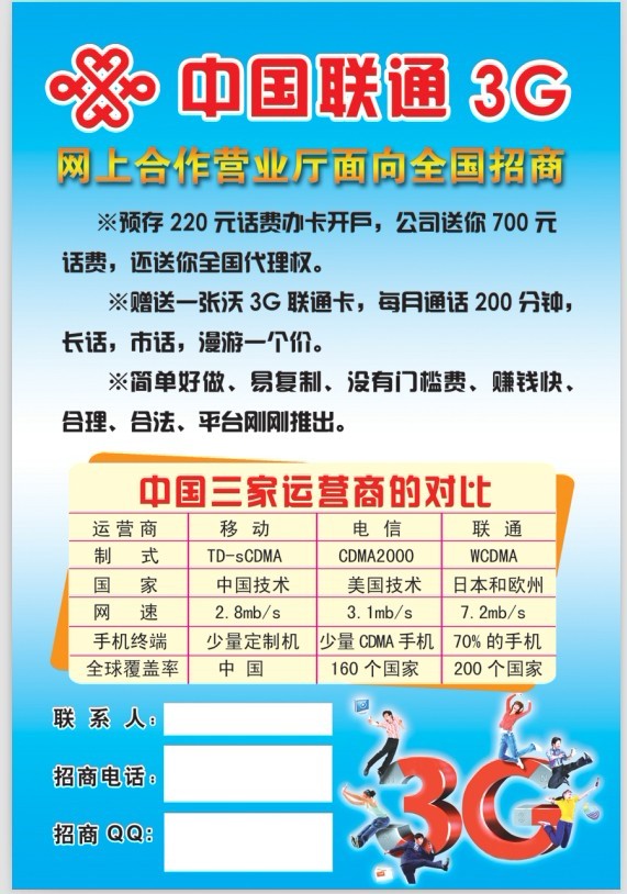 G火爆!商機(jī)!創(chuàng)業(yè)!賺錢!中國聯(lián)通3G事業(yè)向全國免費(fèi)招網(wǎng)上營業(yè)廳代理商。免費(fèi)擁有創(chuàng)業(yè)平臺,免費(fèi)開網(wǎng)上聯(lián)通3G營業(yè)廳的機(jī)會來了。★★聯(lián)通3G新商機(jī)★★★一、什么項目?1、中國聯(lián)3G沃186號段的推廣,傳統(tǒng)是交話費(fèi)送贈品,★現(xiàn)在是存話費(fèi)送創(chuàng)業(yè)機(jī)會。存話費(fèi)送網(wǎng)上營業(yè)廳平臺經(jīng)營權(quán)。預(yù)存220元送460話費(fèi),★送網(wǎng)上聯(lián)通合作營業(yè)廳平臺經(jīng)營權(quán),★送聯(lián)通3G卡。二、如何來做?★自己只需辦理一張:3G186卡;預(yù)