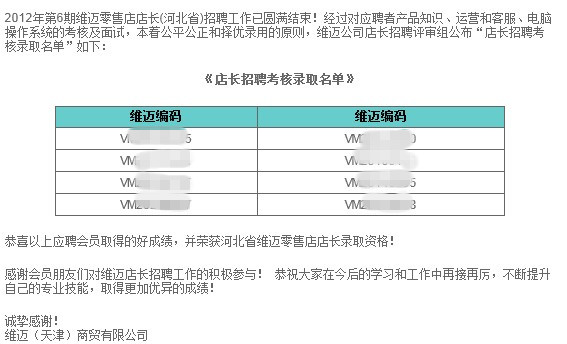 在此重申:維邁店是科士威在中國唯一指定的經(jīng)銷商,開店的名字叫維邁!個人經(jīng)營的店鋪屬于個人行為,一旦出現(xiàn)問題,公司概不負(fù)責(zé)!科士威維邁不是免費(fèi)店,而是公司給個人出房租,水電,裝修,鋪貨,培訓(xùn)等費(fèi)用,不需要個人承擔(dān)風(fēng)險的店長!科士威維邁零售經(jīng)銷商資格考試流程優(yōu)化說明為充分體現(xiàn)維邁零售經(jīng)銷商資格考試公平公正的招考原則,讓參試會員有全方位的能力展示,同時最大限度節(jié)約會員的參試時間及成本,公司現(xiàn)對原有培訓(xùn)考