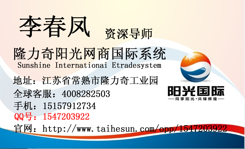 隆力奇陽(yáng)光國(guó)際高級(jí)講師【李春鳳老師】QQ1547203922☆隆力奇陽(yáng)光國(guó)際全球策略委員☆隆力奇陽(yáng)光國(guó)際核心領(lǐng)袖☆隆力奇陽(yáng)光國(guó)際創(chuàng)業(yè)導(dǎo)師如果您厭倦了為別人打工,以苦力交換金錢的生活;如果您厭倦了安利完美直銷的業(yè)績(jī)壓力和無(wú)奈的超前消費(fèi);如果您厭倦了東奔西跑而顧不了家的異地資本運(yùn)作;如果您為急功近利玩時(shí)時(shí)彩或炒股輸?shù)煤軕K;開淘寶店為了買家而發(fā)愁;如果您經(jīng)營(yíng)的其它事業(yè)并不順利;如果您很想自己當(dāng)老板并在家