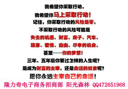 隆力奇陽光國際電子商務,一根網(wǎng)線、一臺電腦,在家開心創(chuàng)業(yè),是我們所有普通人想改變命運的最佳事業(yè)平臺!