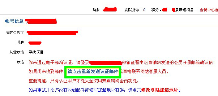 收不到注冊確認(rèn)信的原因可能有幾個: 1、 你注冊時填寫的郵箱地址有錯誤,需要你重新填寫正確的郵箱地址,完成注冊認(rèn)證。 2、 我們給你發(fā)的注冊確認(rèn)信可能被你的郵箱誤認(rèn)為是垃圾郵件,你可以到郵箱中的垃圾信中找找看。 3、 如果你確定郵箱地址沒有填寫錯誤,而且也沒有在垃圾信箱中找到注冊確認(rèn)信,那么你可以嘗試點擊會員中心的“請點擊重新發(fā)送認(rèn)證郵件”。 如下圖: