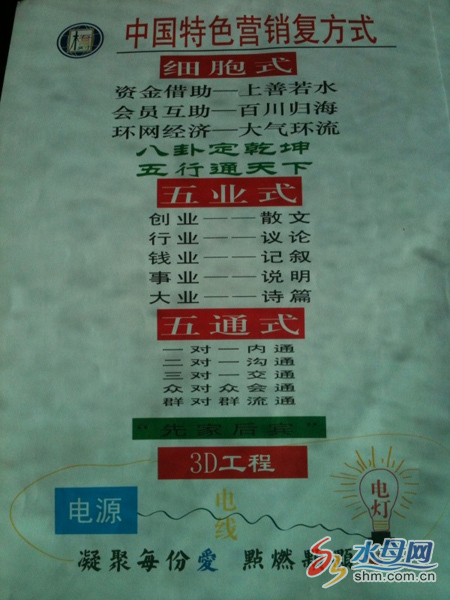 知情人王先生告訴記者,“中國(guó)明明商”不給加入者發(fā)放收據(jù)和任何產(chǎn)品,只發(fā)一張印有“中國(guó)全民借助銀行”的銀行卡,和一套語(yǔ)言極其抽象的資料,如果加入,就被稱為“環(huán)民”,發(fā)展下線成功,就被叫做“薪種”, 上線叫“根”, 下線叫“芽”。