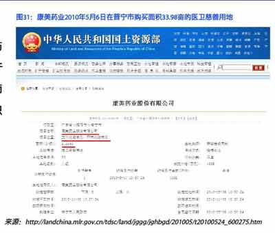 國土資源部網(wǎng)站信息顯示,康美藥業(yè)于2009年11月27日購買了位于普寧市占隴鎮(zhèn)廣汕公路南側(cè)的一塊土地,土地面積2.194公頃(合32.91畝),使用年限是70年,土地成交價277萬元。